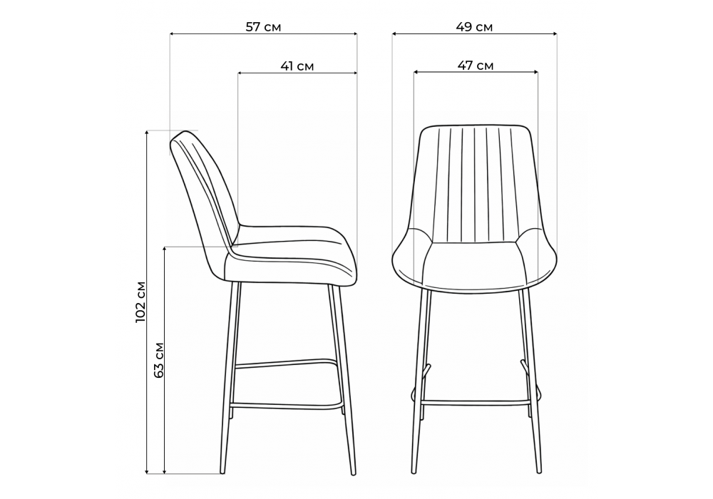 Материал каркаса - металл; Материал сиденья - велюр; Материал обивки - велюр; Цвет ножек - серый; Ширина - 49; Глубина - 57; Высота - 102; Ширина сиденья - 47; Глубина сиденья - 41; Высота сиденья - 63;