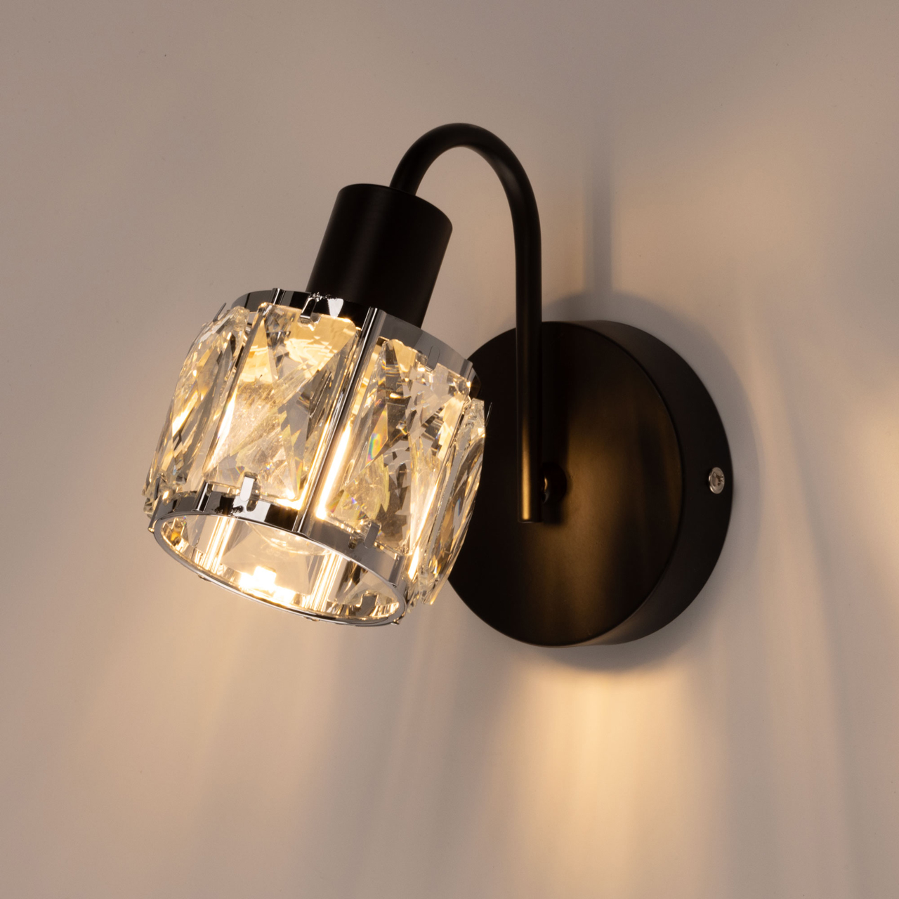 Металлическое основание настенного бра окрашено в черный цвет. Плафон декорирован прозрачным хрусталем прямоугольной формы.