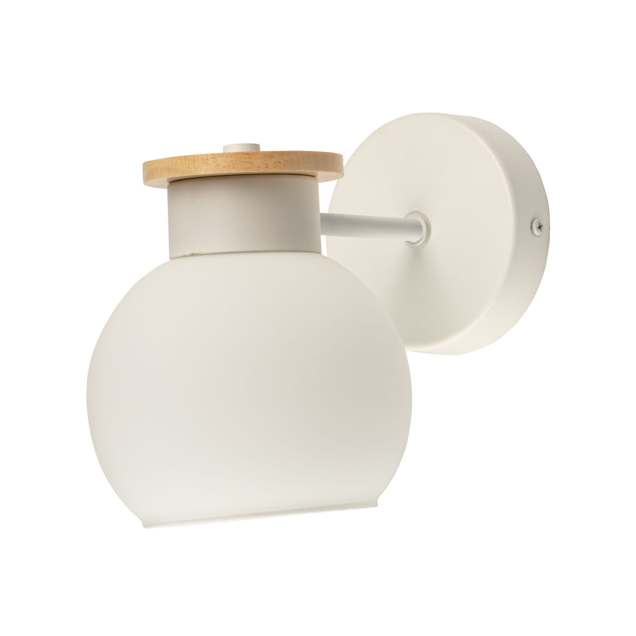 Металлическое основание бра окрашено в белый цвет. Стеклянный плафон отлит в форму и окрашен в белый цвет с внутренней стороны. Светильник декорирован элементом из натурального светлого дерева.