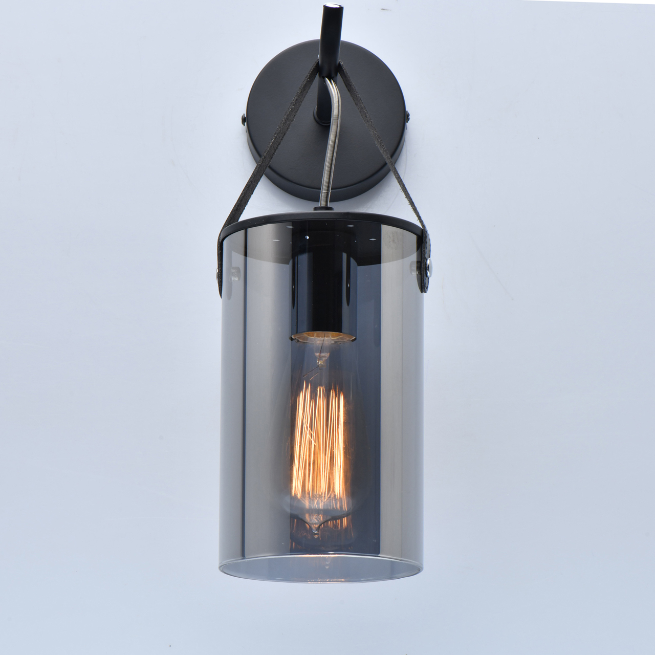 Основание светильника выполнено из металла и окрашено в черный цвет. Стеклянный плафон гальванизирован в цвет антрацита. Плафон крепится к основанию на кожаном ремешке черного цвета.