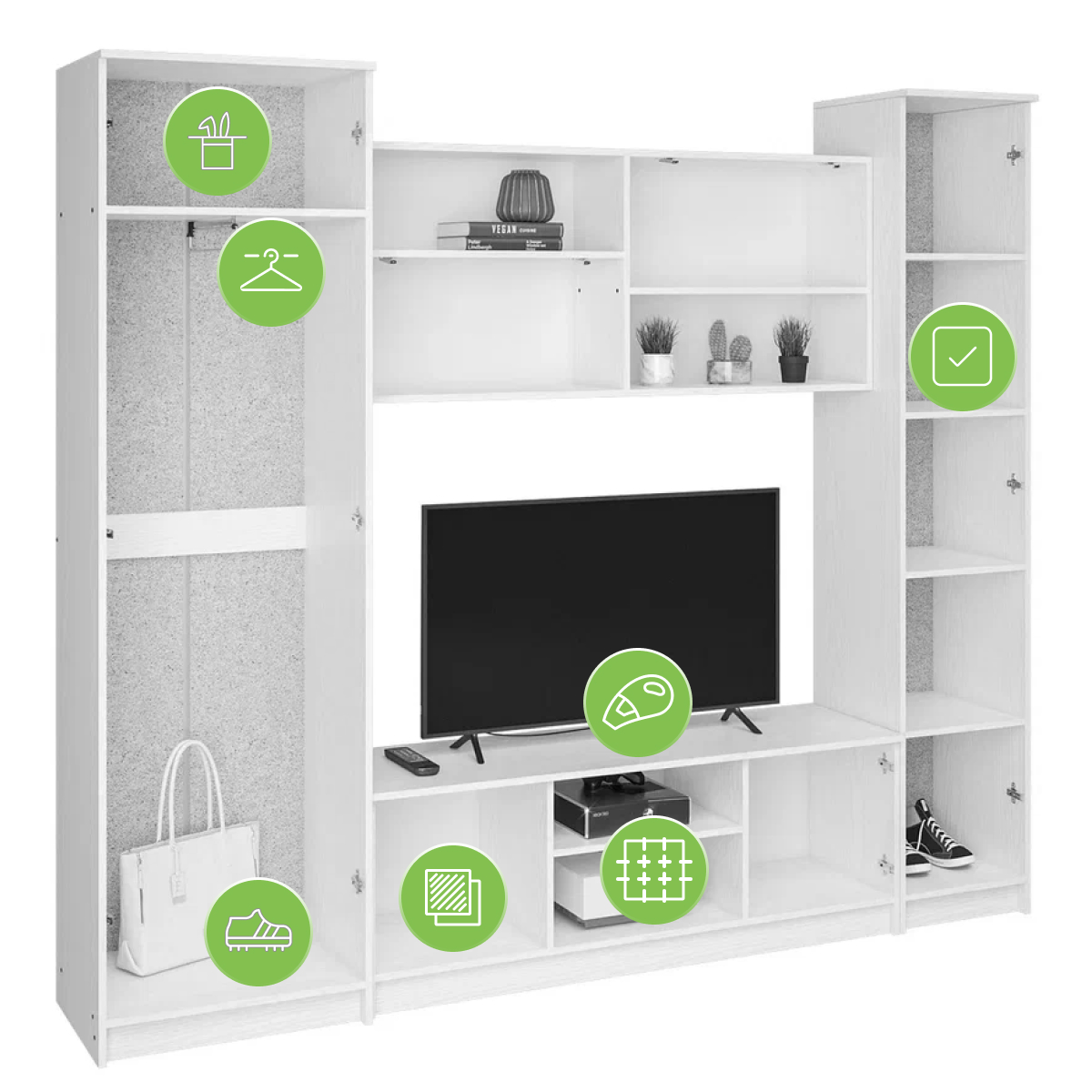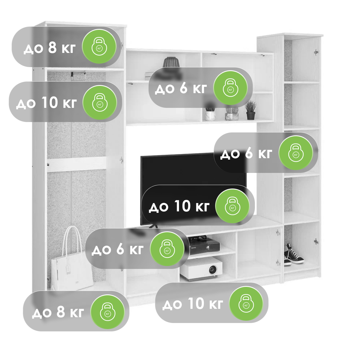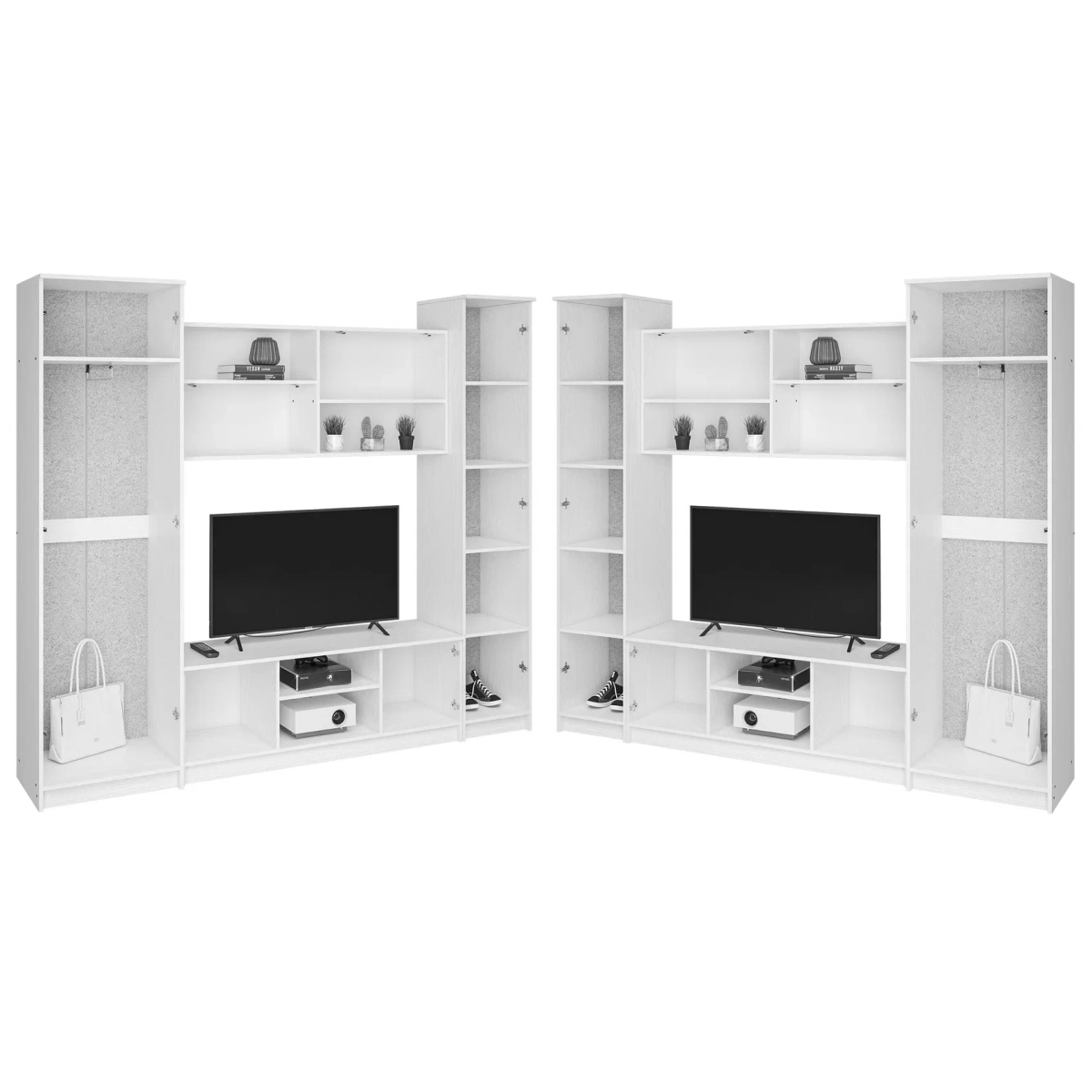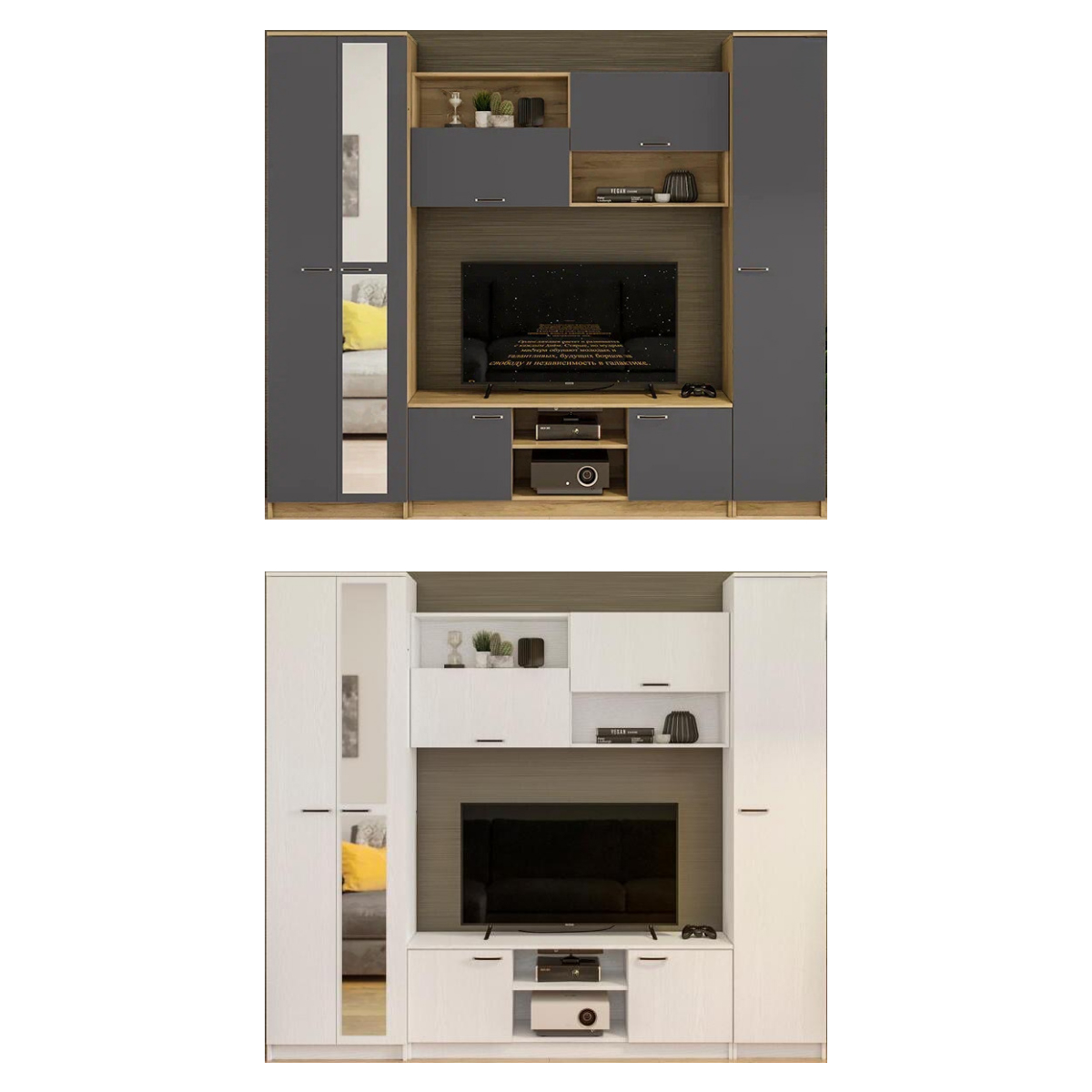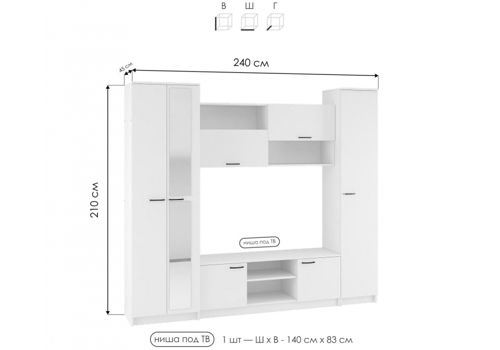 Размер ниши под ТВ: 140 х 83 см. Материал каркаса - ЛДСП; Ширина - 240; Глубина - 45; Высота - 210;