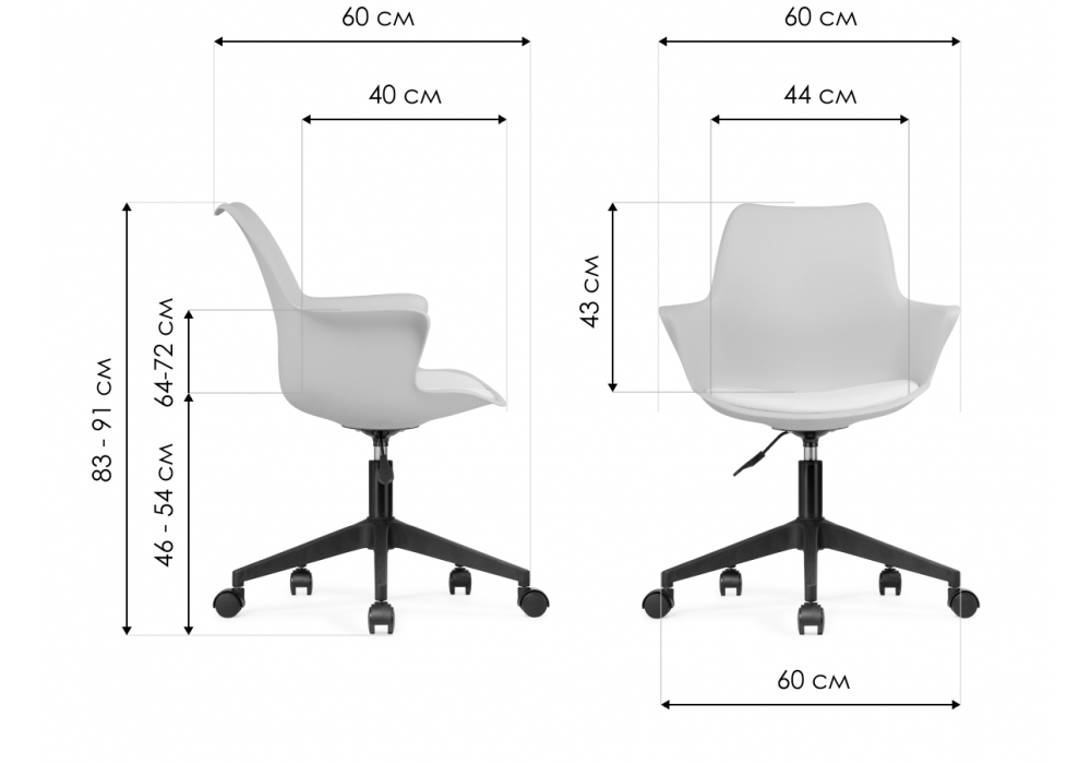 Диаметр крестовины: 60 см. Материал каркаса - пластик; Материал сиденья - пластик, экокожа; Материал обивки - пластик, экокожа; Ширина - 60; Глубина - 60; Высота - 83; Ширина сиденья - 44; Глубина сиденья - 40; Высота сиденья - 46; Высота спинки - 43; Высота максимальная - 91;