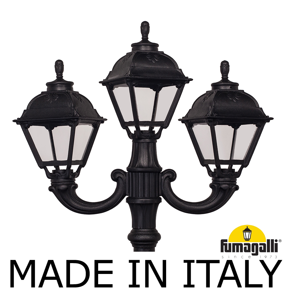 Парковый фонарь FUMAGALLI среднего размера серии CEFA, модель NEBO OFIR/CEFA 2L+1. Парковый фонарь с 2 светильниками на консолях OFIR + 1 венчающий, установленных на классическом столбе NEBO высотой 2,5 м (+высота фонарей на кронштейнах). Изготовлены в Италии, по уникальным технологиям "FUMATECH" из современного композитного полимера RESIN. Этот материал в 5 раз прочнее металла, не ржавеет, не окисляется, не выгорает на солнце, его не нужно красить. Все светильники пыле-влаго защищены по стандарту IP55 (Пылезащищенные, защита от водяных струй с любого направления). Рассеиватель выполнен из антивандального, не мутнеющего и не горючего PMMA (ПолиМетилМетаАкрилат). Срок службы светильника - не менее 20 лет. Температура использования от -60 до +90. В серии CEFA есть садовые фонари в настенном (OFIR/CEFA, MIRRA/CEFA) подвесном (SICHEM/CEFA) и наземном исполнении (IAFAET.R/CEFA, ALOE.R/CEFA, ARTU/CEFA, GIGI/CEFA, RICU/CEFA, NEBO/OFIR/CEFA 1L, NEBO/OFIR/ANNA 2L, TABOR/ADAM/CEFA 3L) со столбами разной высоты, с разным количеством и конфигурацией голов. Консоли настенных фонарей и кронштейны светильников на столбах освещения могут устанавливаться в положение вверх и вниз. Столбы выше 150 см имеют в основе мощную стальную трубу с двойной оцинковкой. При заказе требуется выбрать цвет корпуса, цвет плафона и тип патрона (Е-27 или LED GX-53). Возможен светодиодный вариант. По стилю и дизайну серия уличных светильников CEFA похожа на светильники большого размера серии SIMON . По размеру относится к средним парковым светильникам как серия RUT и GLOBE 300.