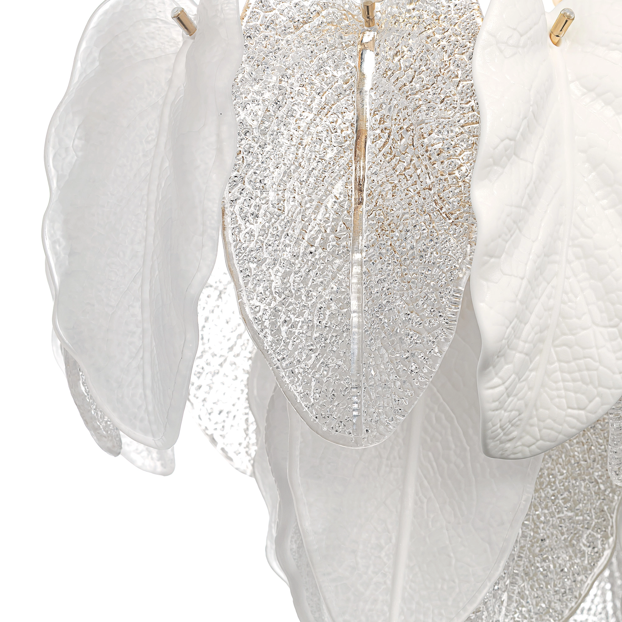 Металлический каркас золотистого оттенка переливается в лучах света. Листья из полуматового и прозрачного рифленого стекла, белой керамики, а также металлические листья с прожилками, отлитые по ювелирной технологии, подчеркивают флористическую изысканность и четкость силуэта люстры. В изделии используются 16 лампочек с цоколем Е14, высоту подвесных цепей можно отрегулировать.