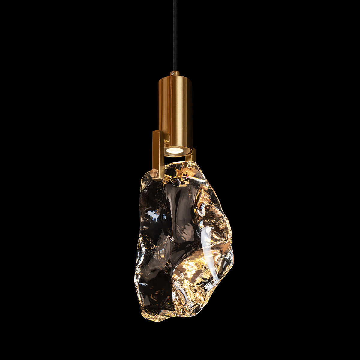Лаконичное сочетание матового золота, прозрачного «камня» и чёрного акцента делает светильник универсальным: он легко вписывается в современный интерьер, лофт, минимализм или эклектичную обстановку. Хорошо смотрится как одиночный акцент над прикроватной тумбой или небольшим столиком, а также впечатляюще выглядит в композиции из нескольких подвесов, расположенных на разной высоте.