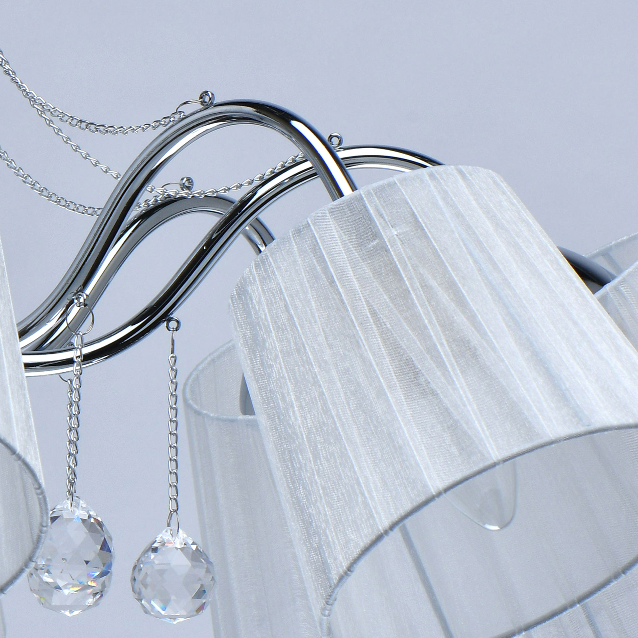 Основание светильника выполнено из сплава металла и гальванизировано в цвет хрома. Абажуры из прозрачной органзы белого цвета с термостойким акрилом внутри. Абажуры отделаны кантом сверху и снизу, прошиты. Светильник декорирован металлическими цепочками в цвет основания и прозрачным хрусталем в форме шара.