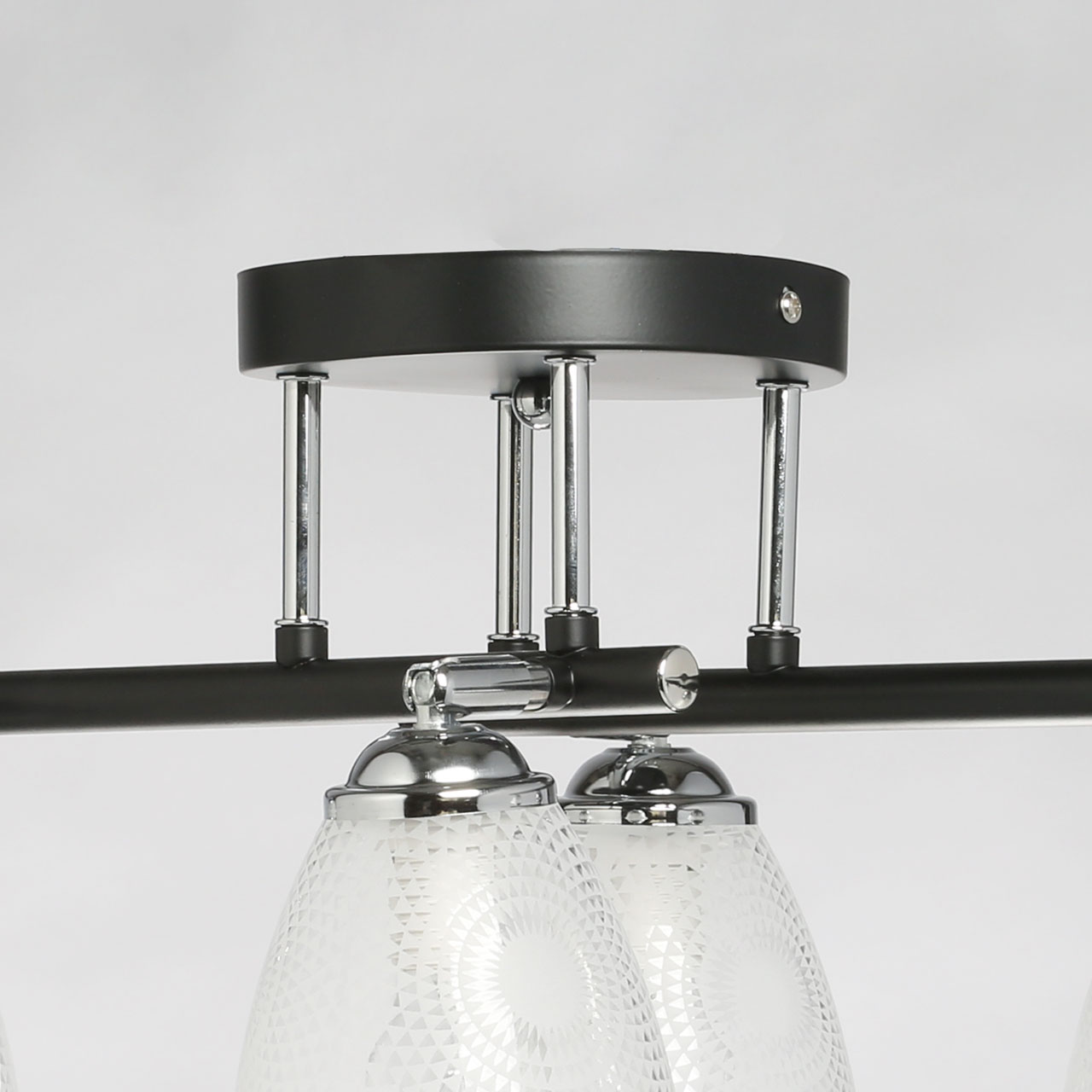 Основание светильника выполнено из металла. Потолочная чаша и рожки окрашены в черный цвет, штанги и держатели плафонов гальванизированы в цвет хрома. Стеклянные плафоны отлиты в форму и матированы по трафарету с оригинальным рисунком.