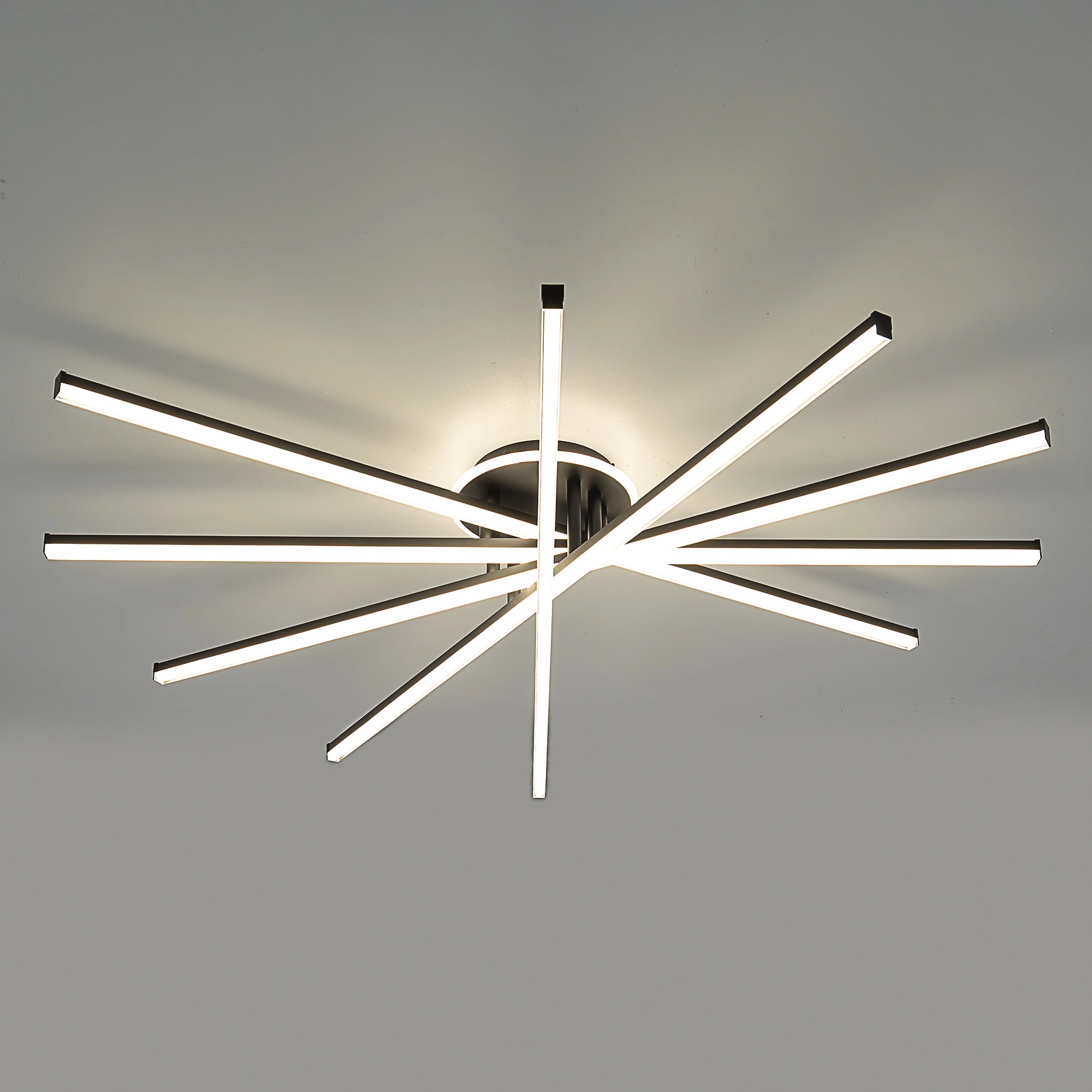 Корпус люстры — из металлического сплава, окрашенного черной краской. Глянцевый рассеиватель — из специализированного оптического полимера. У люстры есть изящная подсветка потолка.