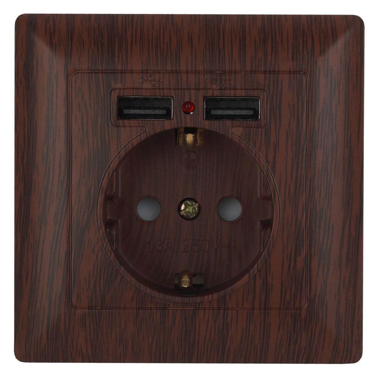 Купить "Розетка ЭРА Intro Solo Schuko P+E 16A 250V со шторками 2хUSB венге 4-410-10 Б0043408"