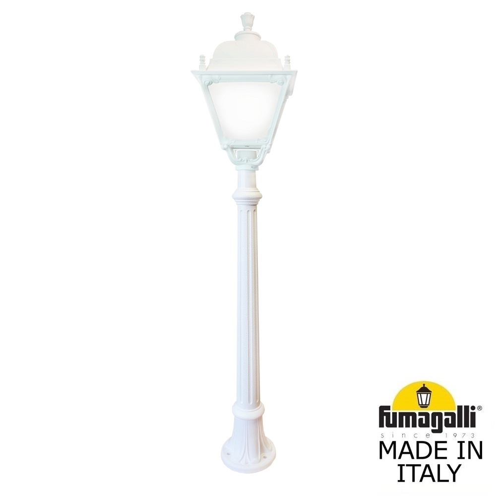Садово-парковый фонарь FUMAGALLI серии SIMON, модель ALOE/SIMON. Садовый фонарь с 1 венчающим светильником большого размера в на классическом садовом столбике ALOE высотой 1,1 м (+высота фонаря). Предназначен для освещения парковых дорожек, cкверов, садовых и ландшафтных композиций, и других общественных пространств. Изготовлены в Италии, по уникальным технологиям "FUMATECH" из современного композитного полимера RESIN. Этот материал в 5 раз прочнее металла, не ржавеет, не окисляется, не выгорает на солнце, его не нужно красить. Все светильники пыле-влаго защищены по стандарту IP55 (Пылезащищенные, защита от водяных струй с любого направления). Рассеиватель выполнен из антивандального, не мутнеющего и не горючего PMMA (ПолиМетилМетаАкрилат). Срок службы светильника - не менее 20 лет. Температура использования от -60 до +90. В серии SIMON есть садовые фонари в настенном (OFIR/SIMON, MIRRA/SIMON) подвесном (SICHEM/SIMON) и наземном исполнении (IAFAET.R/SIMON, ALOE.R/SIMON, ARTU/SIMON, GIGI/SIMON, RICU/SIMON, NEBO/OFIR/SIMON 1L, NEBO/OFIR/SIMON 2L, TABOR/ADAM/SIMON 3L) со столбами разной высоты, с разным количеством и конфигурацией голов. Консоли настенных фонарей и кронштейны светильников на столбах освещения могут устанавливаться в положение вверх и вниз. Столбы выше 150 см имеют в основе мощную стальную трубу с двойной оцинковкой. При заказе требуется выбрать цвет корпуса, цвет плафона и тип патрона (Е-27 или LED GX-53). Возможен светодиодный вариант. По стилю и дизайну серия уличных светильников SIMON похожа на светильники среднего размера серии CEFA. По размеру относится к большим парковым светильникам как серия NOEMI и GLOBE 400.