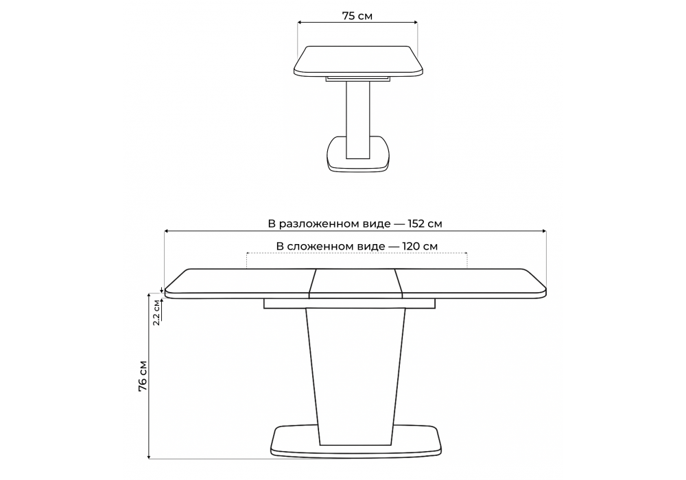 Толщина столешницы: 2,2 см. Материал каркаса - ЛДСП; Ширина - 75; Высота - 76; Длина стола в разложенном виде - 152; Длина - 120;