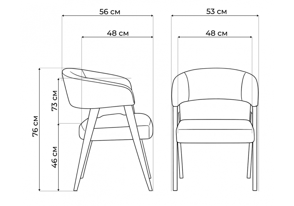 Материал каркаса - массив дерева; Материал сиденья - ткань; Материал обивки - ткань; Ширина - 53; Глубина - 56; Высота - 76; Ширина сиденья - 48; Глубина сиденья - 48; Высота сиденья - 46;