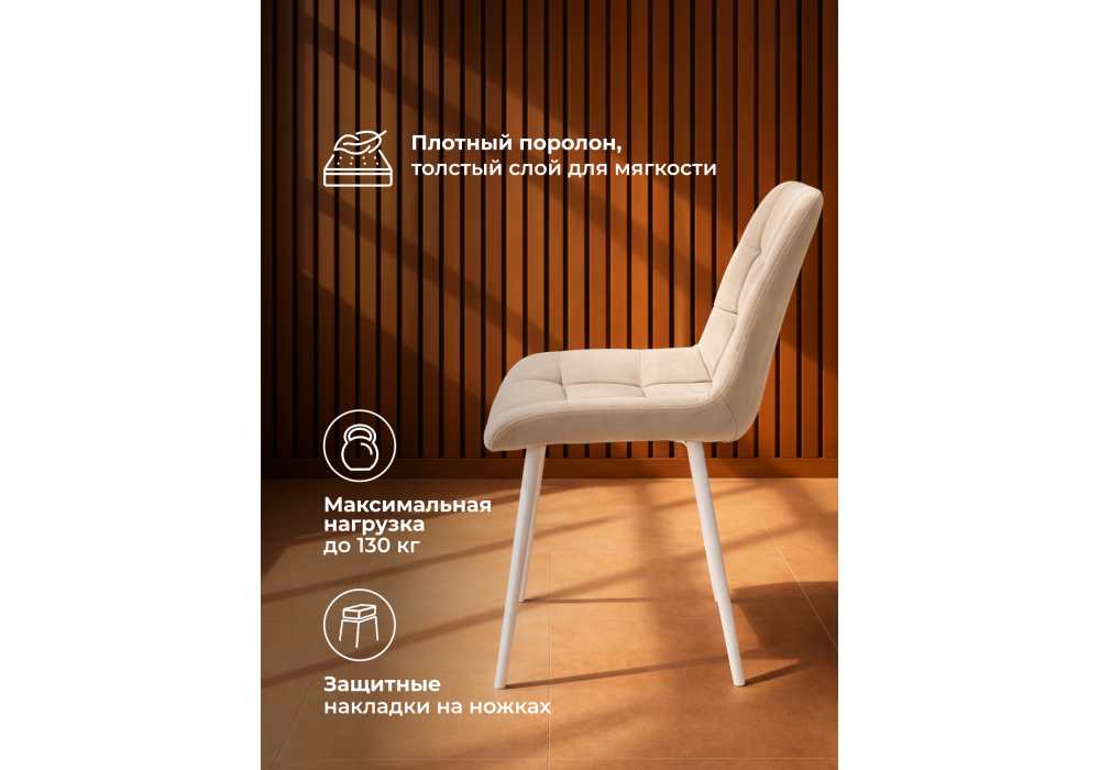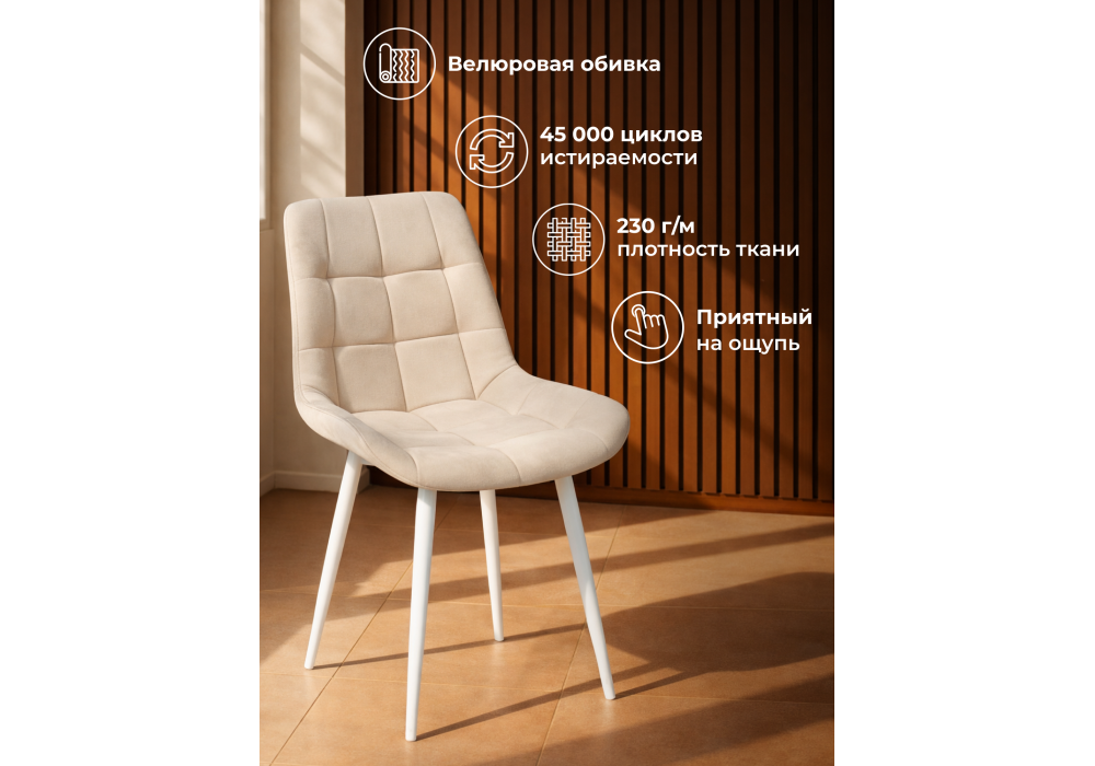 Материал каркаса - металл; Материал сиденья - велюр; Материал обивки - велюр; Цвет ножек - белый; Ширина - 50; Глубина - 60; Высота - 80; Ширина сиденья - 44; Глубина сиденья - 41; Высота сиденья - 48;