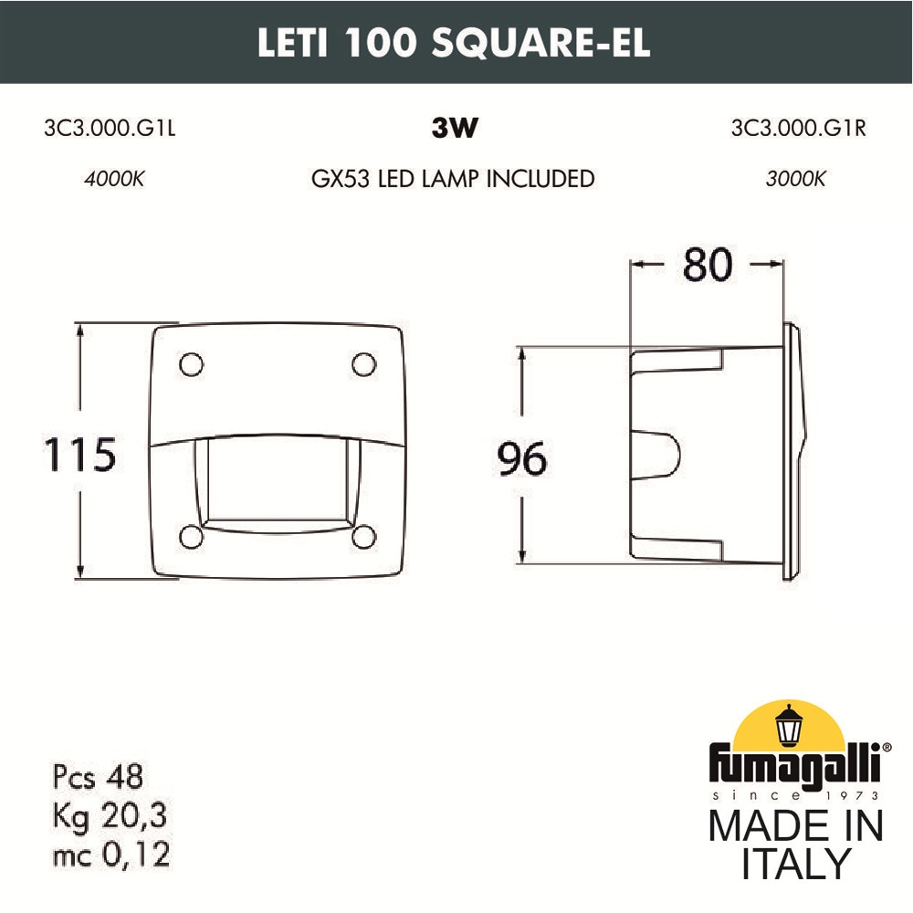 Светильник для подсветки лестниц встраиваемый FUMAGALLI серии LETI, модель LETI 100 Square-EL - изготовлен в Италии. Основное назначение - мягкое, акцентное освещение небольших площадей, световой дизайн, ландшафтная подсветка. Отлично подходит для освещения лестничных маршей, коридоров, подпорных стенок, ландшафтного освещения. Устанавливается в вертикальные поверхности, например в стены, колонны, откосы ступеней. В поверхность монтируется и закрепляется закладной элемент "стакан", в который выводится электрический провод. Далее, в эту деталь устанавливается сам уличный светильник LETI и подключается электропитание. Корпус изготовлен из современного вандалостойкого, негорючего полимера RESIN не требующего окраски. Прочного, окрашенного в массе, не ржавеющего и не выгорающего на солнце. Все светильники пыле-влаго защищены по стандарту IP66. Корпус ландшафтного светильника не проводит электричество, относится к 2 классу электробезопасности. Рассеиватель выполнен из антивандального, не мутнеющего и не горючего PMMA. Срок службы светильника - не менее 20 лет. Не требуется трансформатор. Напряжение питания - 220 В. Температура использования от -60 до +90. При заказе требуется выбрать цвет корпуса.