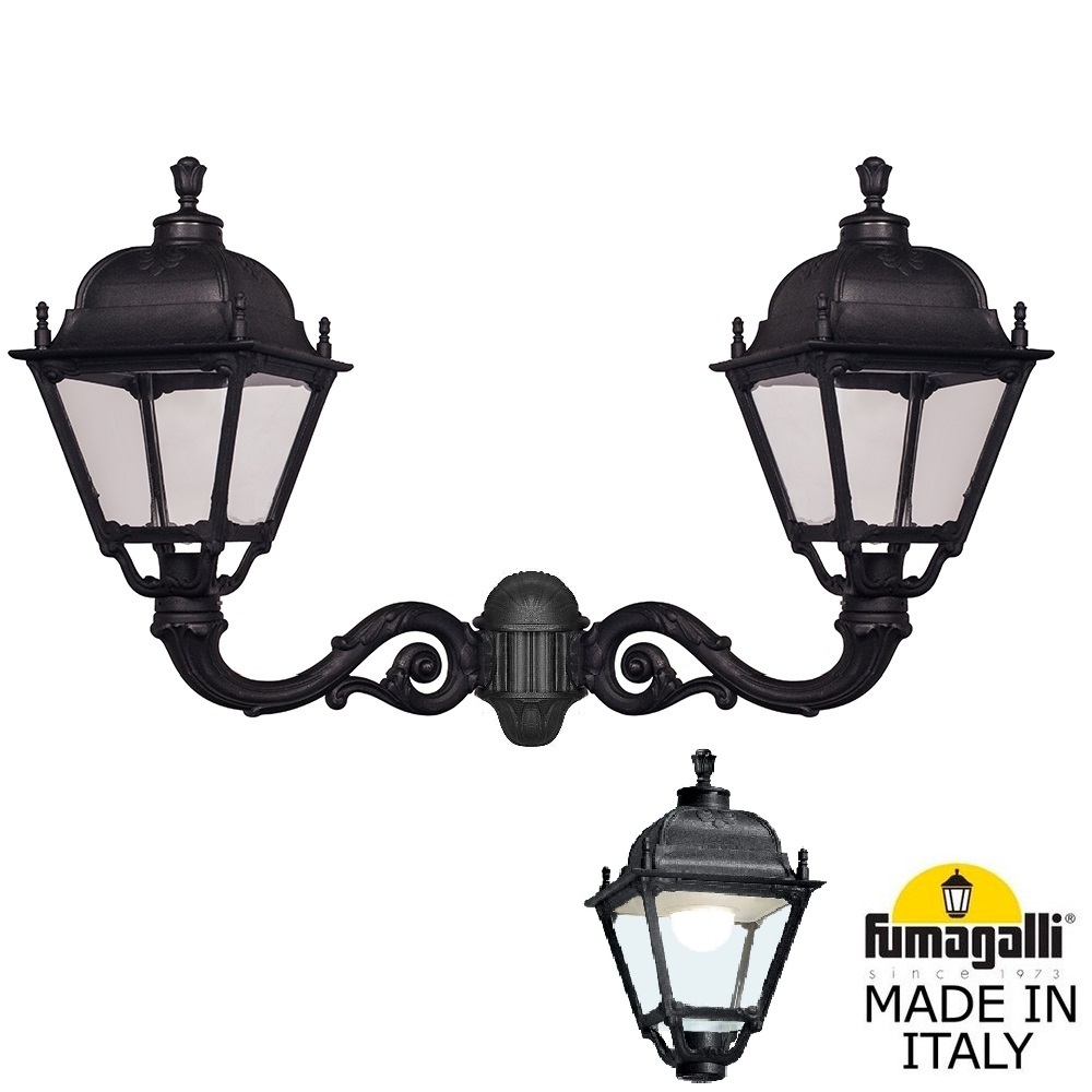 Светильник уличный настенный FUMAGALLI большого размера серии SIMON, модель EVA/SIMON. Двойной настенный уличный фонарь, большого размера с креплением на стену с помощью 2 консолей ADAM большого размера. Устанавливается на стены домов, котеджей, заборов и других вертикальных поверхностей. Используется для освещения входных групп, общего уличного освещения, декоративной и фасадной подсветки. Изготовлены в Италии, по уникальным технологиям "FUMATECH" из современного композитного полимера RESIN. Этот материал в 5 раз прочнее металла, не ржавеет, не окисляется, не выгорает на солнце, его не нужно красить. Все светильники пыле-влаго защищены по стандарту IP55 (Пылезащищенные, защита от водяных струй с любого направления). Рассеиватель выполнен из антивандального, не мутнеющего и не горючего PMMA (ПолиМетилМетаАкрилат). Срок службы светильника - не менее 20 лет. Температура использования от -60 до +90. В серии SIMON есть садовые фонари в настенном (OFIR/SIMON, MIRRA/SIMON) подвесном (SICHEM/SIMON) и наземном исполнении (IAFAET.R/SIMON, ALOE.R/SIMON, ARTU/SIMON, GIGI/SIMON, RICU/SIMON, NEBO/OFIR/SIMON 1L, NEBO/OFIR/SIMON 2L, TABOR/ADAM/SIMON 3L) со столбами разной высоты, с разным количеством и конфигурацией голов. Консоли настенных фонарей и кронштейны светильников на столбах освещения могут устанавливаться в положение вверх и вниз. Столбы выше 150 см имеют в основе мощную стальную трубу с двойной оцинковкой. При заказе требуется выбрать цвет корпуса, цвет плафона и тип патрона (Е-27 или LED GX-53). Возможен светодиодный вариант. По стилю и дизайну серия уличных светильников SIMON похожа на светильники среднего размера серии CEFA. По размеру относится к большим парковым светильникам как серия NOEMI и GLOBE 400.