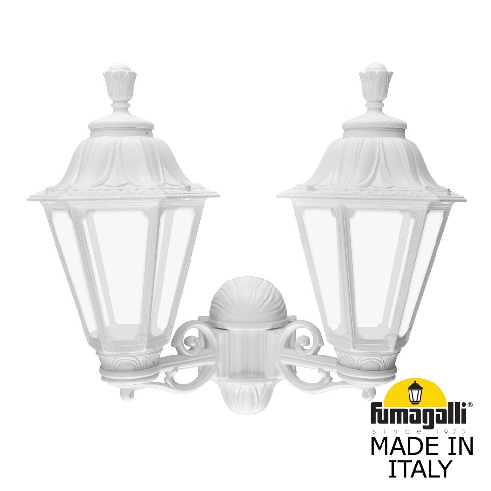 Светильники уличные настенные FUMAGALLI серии RUT, модель PORPORA/RUT. Консольный уличный светильник из 2-х фонарей RUT, на кронштейнах BISSO малого размера, для монтажа на стену. Используются для фасадного и архитектурного освещения в стиле "классика". Место установки уличных светильников - фасады, колонны и другие вертикальные поверхности исторических зданий, котеджей, загородных домов, церквей, а так же, другие места где требуется и возможна установка фонарей. Изготовлены в Италии, по уникальным технологиям "FUMAGALLI" из современного композитного полимера RESIN. Этот материал в 5 раз прочнее металла, не ржавеет, не окисляется, не выгорает на солнце, его не нужно красить. Все светильники пыле-влаго защищены по стандарту IP55 (Пылезащищенные, защита от водяных струй с любого направления). Рассеиватель выполнен из антивандального, не мутнеющего и не горючего PMMA (ПолиМетилМетаАкрилат). Срок службы светильника - не менее 20 лет. Температура использования от -60 до +90. В серии RUT есть фонари в настенном (BISSO/ RUT, OFIR/ RUT, MIRRA/ RUT, PORPORA/ RUT) подвесном (SICHEM/ RUT) и наземном исполнении (MINILOT/ RUT, MIZAR.R/ RUT, IAFAET.R/ RUT, ALOE.R/ RUT, ARTU/ RUT, GIGI/ RUT, RICU/ RUT, RICU/ISSO/ RUT 2L, NEBO/ RUT, NEBO OFIR/ RUT 2L, NEBO OFIR/ RUT 3L) со столбами разной высоты, с разным количеством и конфигурацией голов. Консоли настенных фонарей и кронштейны светильников на столбах освщения могут устанавливаться вверх/вниз. Столбы выше 150 см имеют в основе мощную стальную трубу с двойной оцинковкой. При заказе требуется выбрать цвет корпуса, цвет плафона и тип патрона. По стилю и дизайну серия уличных светильников RUT похожа на светильники малого размера серии ANNA и на светильники большого размера серии NOEMI. По размеру RUT относится к средним светильникам как серия CEFA, SALEM и GLOBE 300.